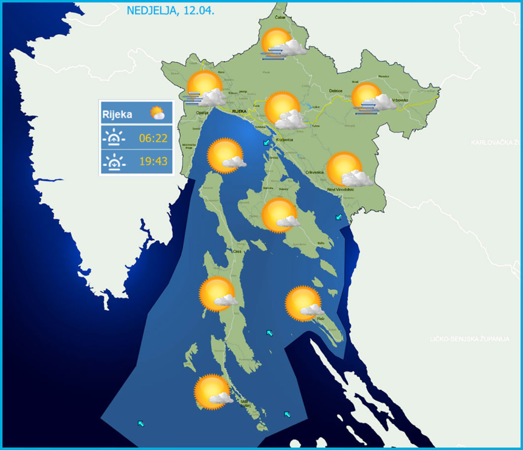 Pretežno sunčano i danju razmjerno toplo, prema gorju ujutro više naoblake. Vjetar na kopnu većinom slab, u višem gorju do umjeren sjeveroistočni, u Primorju ujutro burin, od sredine dana će na moru zapuhati jugo i jačati. Jutarnje temperature zraka prema gorju između -1 i 6, prema obali od 7 do 12 °C. Najviše dnevne vrijednosti uglavnom od 19 do 23 °C.